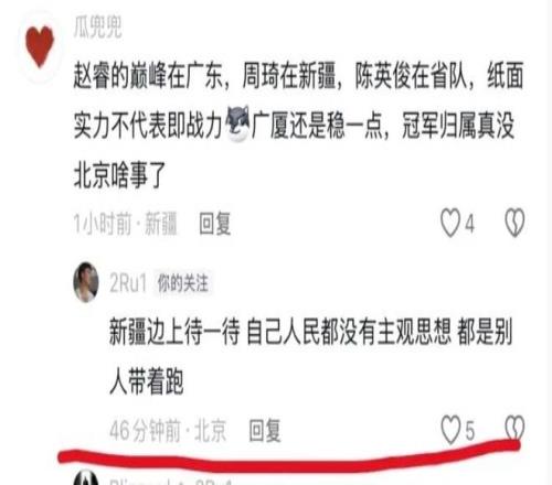 北京男篮在主场不敌青岛男篮,这场比赛是球队历史上首次在主场输给对手。比赛结束后,很多北京球迷都表达了对球队表现的不满,也有不少球迷喊话主教练许利民下课。有新疆球迷在社交媒体上发表了自己的看法,认为赵睿、周琦、陈盈骏等球员都过了巅峰期,冠军归属真没北京男篮啥事。这位新疆球迷的表达引发了赵睿的关注,他在下面进行了留言,但却引发了球迷的不满,不少球迷纷纷打电话进行举报。