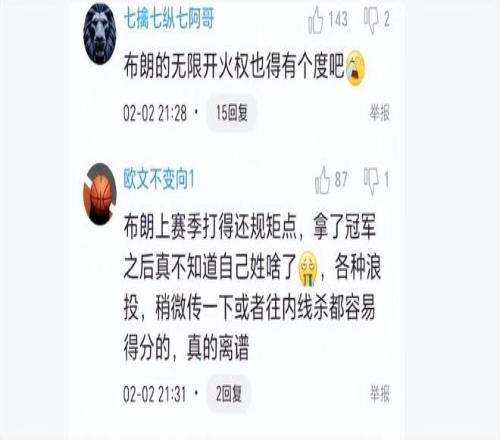布朗是上赛季夺冠英雄,被评为总决赛MVP。但从此也飘了,飘得似乎不知自己姓什么了。球迷怒批道,“布朗上赛季打得还规矩点,拿了冠军之后真不知道自己姓啥了,各种浪投,稍微传一下或者往内线杀都容易得分的,真的离谱”、“布朗的无限开火权也得有个度吧”。广厦再任由布朗这么打,这赛季完了,最近几场都没什么配合,全是抡,都想当大哥,心态完全不对,太飘了。