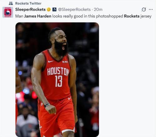 休媒SR写道:这张哈登“PS”的火箭球衣照片看起来他的状态非常之好。