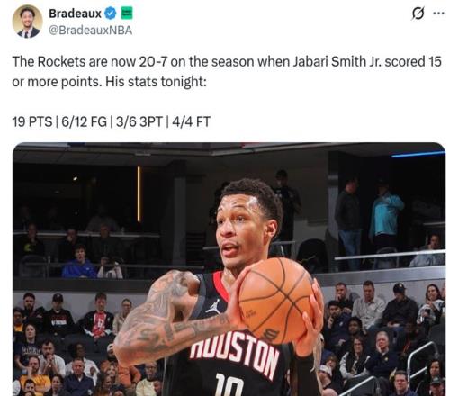 全场12中6,三分6中3,交出19分4板1助1断1盖帽全能数据,当他本赛季得分15+时,火箭队战绩为20胜7负。