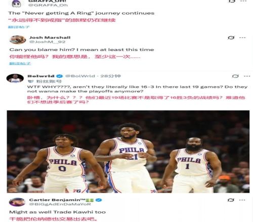 另外有网友说:“哈登一辈子拿不到总冠军戒指,他的旅程还在继续。”、“如果交易他,那不如把莱昂纳德也一起交易掉。”、“最近19场比赛,快船的战绩是16胜3负,他们难道不想打季后赛了吗?”、“快船的状态本来已经回来了,现在他们是联盟里势头最火热的球队,哈登居然想走,背后是不是发生了什么我们不知道的内幕?”可以看到大部分的网友其实还是不懂,为什么在这个时间点,哈登会和快船商量着走人。