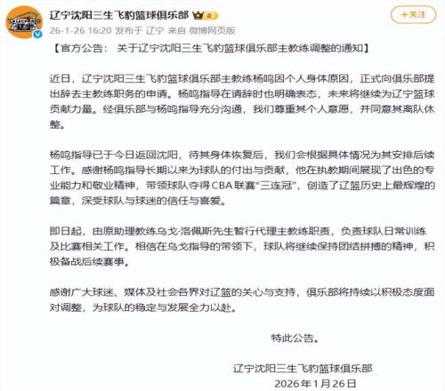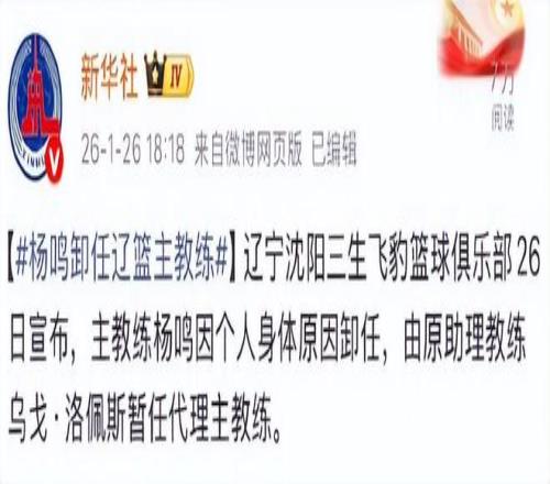 首先是辽宁队官方发布的公告里写着“杨鸣因个人身体原因辞职”。