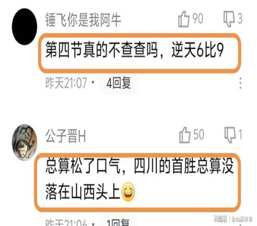 末节双方打了个6-9比分,赛后网友们也是纷纷吐槽道“第四节真的不查查吗,逆天6比9。”;“总算松了口气,四川的首胜总算没落在山西头上”;“好一个6-9,这不是你想的那个69式,而是中国职业篮球第一联赛单节得分,牛的嘞!”;“我让我村里打球赛的朋友上去打也不止这个分数”;“单节6-9,跟韩国6分钟多钟不得分一样离谱”;“单节两队6-9,是职业球员干的事吗?”……