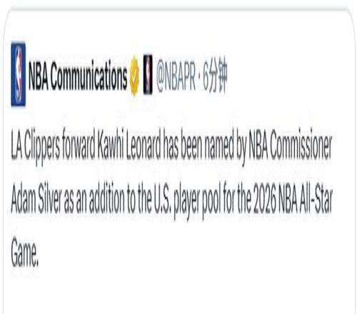 北京时间2月4日,洛杉矶快船队前锋科怀-莱昂纳德,已由NBA总裁亚当-萧华宣布增补入选2026年全明星赛美国队球员大名单。