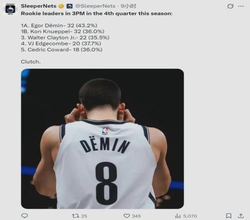 克尼佩尔无疑是三分火力最猛的2025届新秀,本赛季他已经投进166记三分,高居联盟第三,仅次于库里(175)和米切尔(175)。此外,克尼佩尔本赛季三分命中率42.5%,排名联盟第19。但是,他在末节的三分命中率不如杰明。