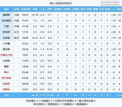 湖人:詹姆斯25分3板7助3断、东契奇24分6板5助、拉拉维亚18分5板、里夫斯15分4板1助2断、海斯9分1板2助、艾顿7分8板3助、范德比尔特6分5板3助、斯玛特6分3板1助
