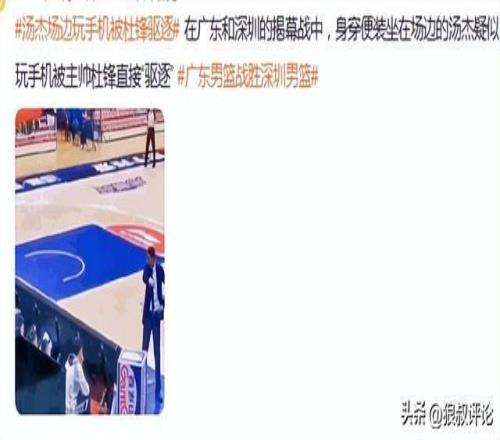外界重点关注汤杰玩手机,大概率是广东对阵深圳的比赛,杜锋要求年轻球员需要认真看比赛,但汤杰在替补席后面玩手机,怒气值拉满杜锋直接驱逐了汤杰离场。