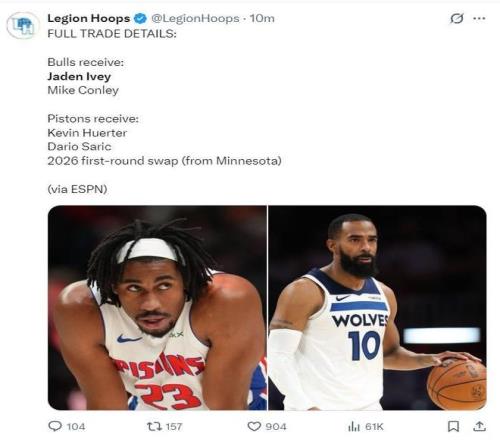核心框架是:公牛送出23岁的后卫杰登·艾维,从森林狼得到38岁的控卫迈克·康利,活塞则从森林狼得到后卫凯文·赫尔特与前锋达里奥·萨里奇,森林狼作为促成交易的一方,主要收获是来自公牛的2026年首轮签互换权以及一个价值250万美元的交易特例。