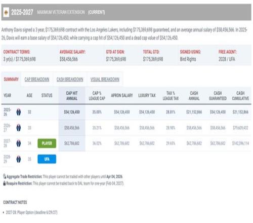 浓眉三年1.75亿的合同正在执行第一年,26-27赛季价值5845万、27-28赛季价值6278万(球员选项),浓眉在明年夏天就有资格谈新的提前续约问题,独行侠送走浓眉的一个关键因素就是他的续约问题。