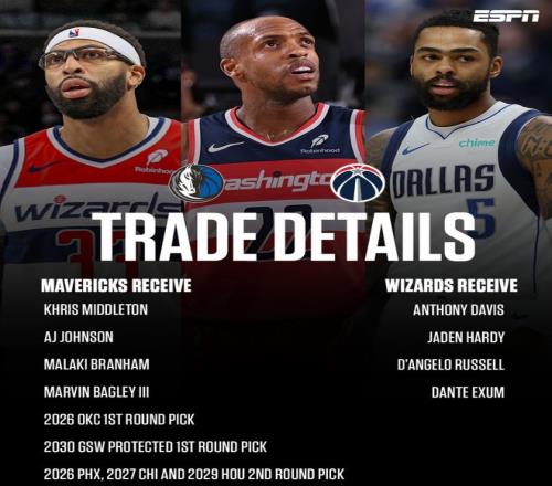 达拉斯独行侠、华盛顿奇才达成了大交易,独行侠送出浓眉、哈迪、拉塞尔、艾克萨姆从奇才换来米德尔顿、AJ-约翰逊、布兰纳姆、巴格利、2首轮、3次轮。