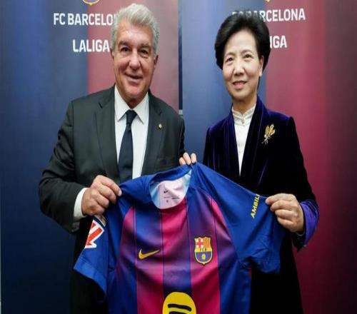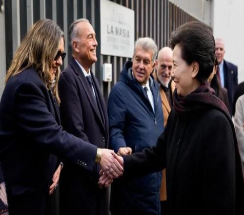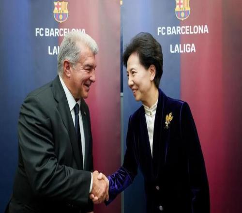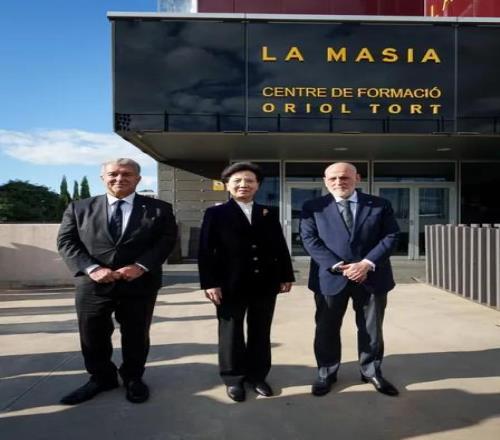 巴塞罗那足球俱乐部主席拉波尔塔与西甲联盟主席特巴斯,共同欢迎由中国国务委员谌贻琴率领的中国代表团访问巴萨拉玛西亚青训营。