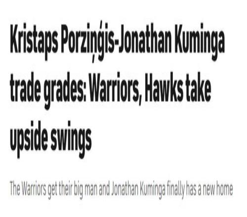 若波尔津吉斯保持健康,勇士队这笔交易无疑能拿到A+的高分。多年来,勇士队一直渴望得到这类球员。今年休赛期签下霍福德的部分原因,就是为了给格林搭配一位具备外线投射能力的中锋。勇士队此前从未拥有过像波尔津吉斯这样身材高大、擅长护筐的内线球员,他在篮下的身高优势也能为球队补齐此前长期存在的短板。