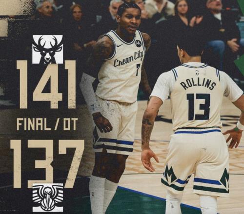加时赛,特纳三分命中,雄鹿占据主动,AJ格林三分也进,琼斯三分命中咬住,锡安造杀伤继续追分,罗林斯两罚一中雄鹿领先2分,锡安进攻犯规,小波特两罚全中锁定胜局。最终,雄鹿141-137击败鹈鹕。