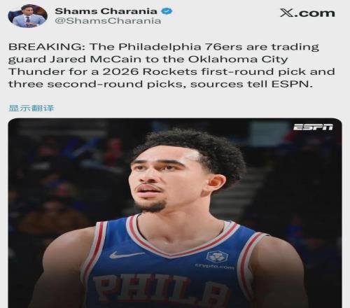 爆料王Shams:费城将“魔仙哥”麦凯恩送至雷霆,换回1个首轮签+3个次轮签。