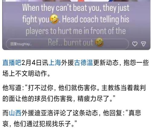 另一方面,涉及本次事件的上海队外援古德温,近期一直处于舆论的焦点,此前他曾在社交媒体上发表过针对广东队教练的言论,而本场比赛他再次在关键时刻成为影响比赛走势的人物。