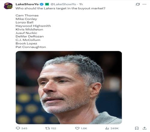 湖人媒体LakerShowYo晒出了潜在的买断市场名单,他认为这些球员是湖人可以尝试追求的对象:托马斯、康利、朗佐鲍尔、海史密斯、米德尔顿、努尔基奇、德罗赞、麦科勒姆、大洛、康诺顿。