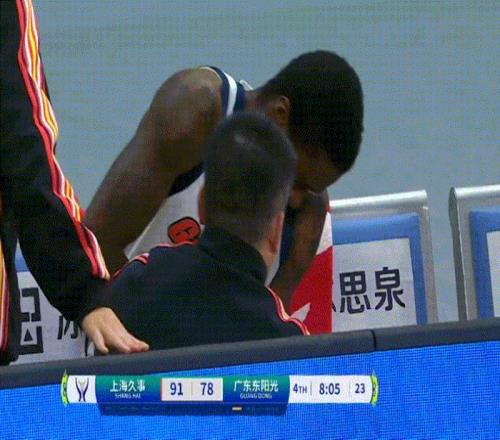 这次意外事件让萨姆纳的肘关节遭到重创,下场时表情十分痛苦,在替补席疼得嗷嗷叫,身边的黄明依也是有点不敢看,萨姆纳上半场过早领到4犯,第四节伤退下场,是广东队第四节没能完场翻盘的原因之一。