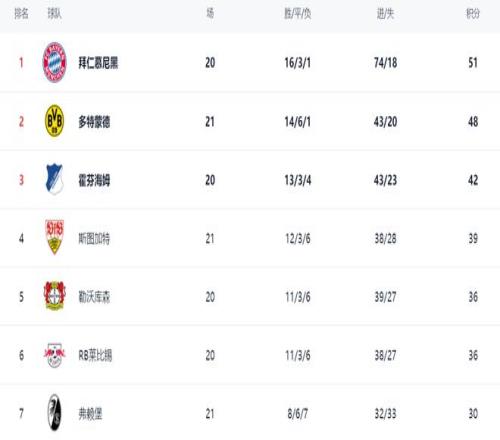 在积分榜上,拜仁依然占据榜首位置,16胜3平1负,拿到51分。而多特蒙德不断赢球之后,总积分已经达到48分,只落后拜仁3分。不过,多特蒙德比拜仁多踢1场。霍芬海姆以42分排名第3。第4的是斯图加特,拿到了39分。勒沃库森以36分排名第5。莱比锡也是36分,排名第6。勒沃库森和莱比锡与欧冠区的差距都只有3分。弗赖堡拿到30分,排第7。