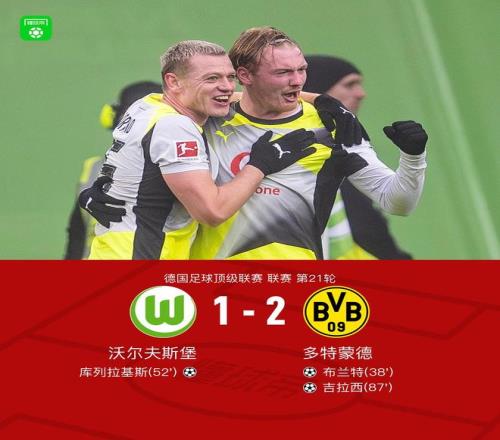 北京时间2月7日德国足球顶级联赛 联赛 第21轮,沃尔夫斯堡主场对阵多特蒙德。上半场瑞尔森开出角球,布兰特头球破门。下半场阿诺德开出任意球,库列拉基斯头球破门,比赛尾声恩梅加带球推进后传球,席尔瓦助攻吉拉西绝杀。最终多特2-1客胜沃尔夫斯堡。