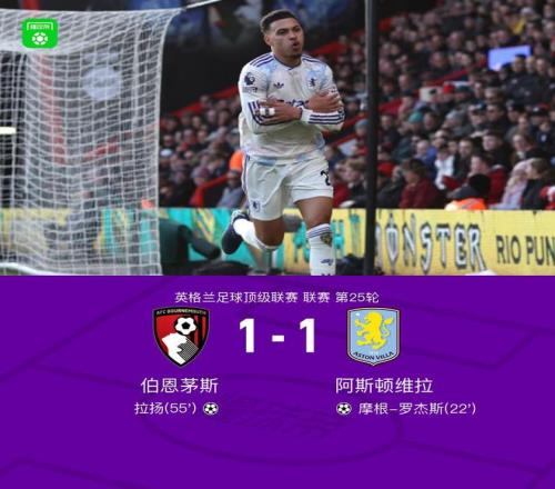 北京时间2月7日英格兰足球顶级联赛 联赛 第25轮,伯恩茅斯主场对阵阿斯顿维拉。伯恩茅斯拉扬破门。阿斯顿维拉摩根-罗杰斯破门。最终比分伯恩茅斯 1-1 阿斯顿维拉。
