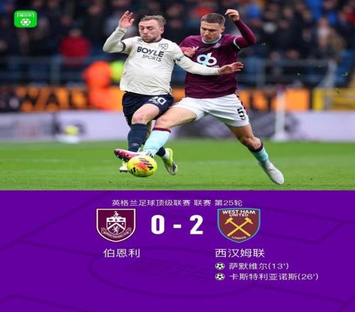 北京时间2月7日英格兰足球顶级联赛 联赛 第25轮,伯恩利主场对阵西汉姆联。西汉姆联萨默维尔破门,卡斯特利亚诺斯破门。最终比分伯恩利 0-2 西汉姆联。