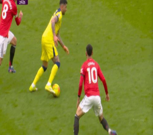 这看似是热刺即将成功把曼联憋在后场的前奏,因为在这里上身体的话,热刺要么成功夺回球权,要么用一次不会招致黄牌的犯规回到后场,结果曼联用大脚找到了来到中路的阿玛德-迪亚洛,立刻形成了一次威胁进攻: