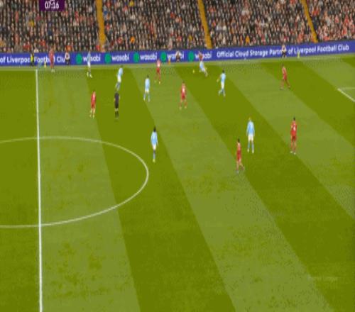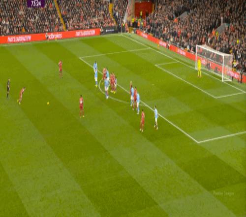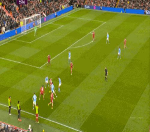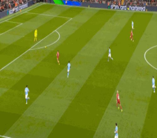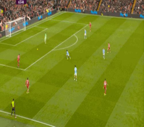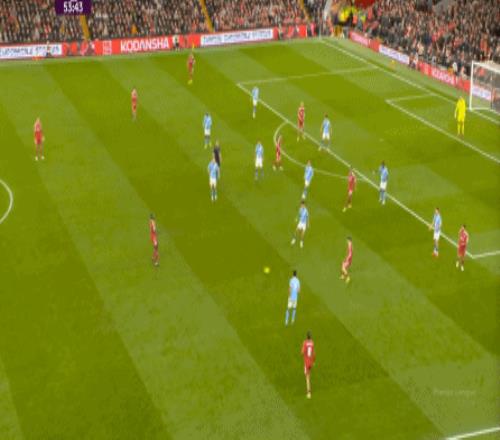 这在战术上不会有特别明显的变化,所以曼城的表现并未立刻改善,于是在第73分钟,利物浦在由左至右的转移过程中打出进攻,随后在二点争夺中制造了定位球:
