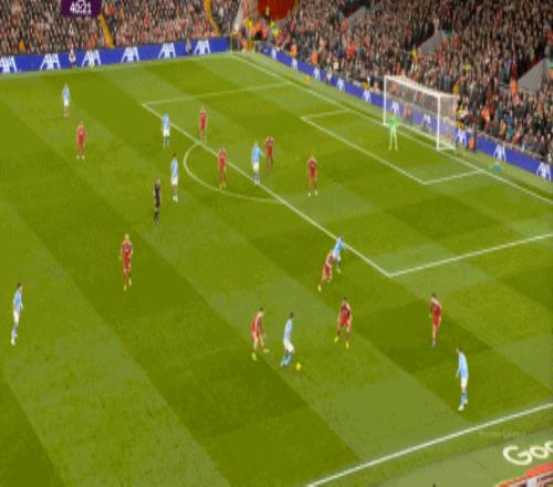 当然了,利物浦的进攻威胁程度和曼城还是没法比,萨拉赫的确不负当年之勇,但埃基蒂克和维尔茨也没有什么像样的表现,所以曼城很快重新掌握大局,在第33分钟,用利物浦的失误和自身的跑位,带着维尔茨的罗德里在右路送出了传中: