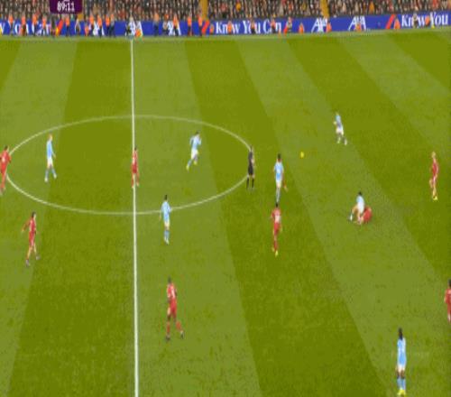 到了这个时候,有经验的教练就会有所警惕了,但利物浦还在进行高位逼抢,尽管他们可以逼迫曼城开大脚,但大脚落到前场,曼城有机会凭借前场的个人能力直接形成进攻: