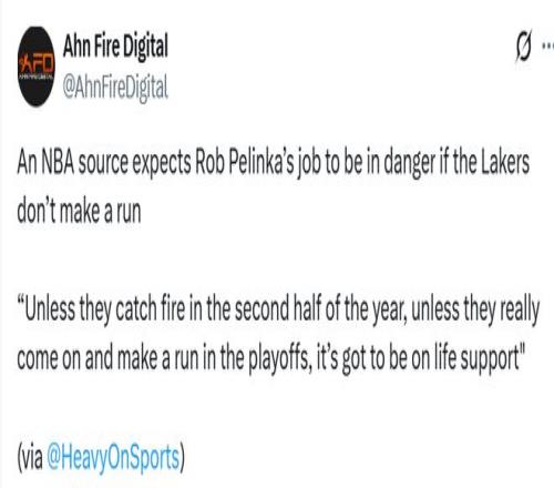 美媒Heavy报道称,一位NBA消息源称:“除非湖人下半程突然爆发、在季后赛打出一番成绩,否则佩林卡的位置岌岌可危,很难继续留任。拥有詹姆斯和东契奇,今年还要打附加赛的话,已经没什么借口可找。佩林卡在联盟里还有威信吗?他有清晰的建队蓝图吗?这才是问题所在。”