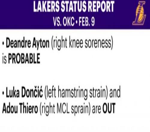 湖人东契奇因左腿筋伤势继续缺阵,蒂耶罗(右膝内侧副韧带扭伤)也无法出战。