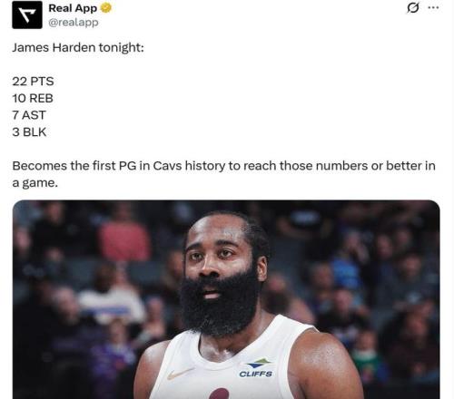 值得一提的是,哈登在此役还创下了神迹。数据显示,哈登是骑士队史首位单场砍下至少22分10篮板7助攻3盖帽的控卫球员。