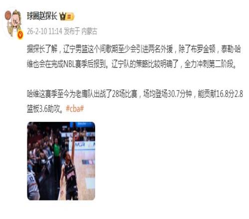 除此之外,根据媒体人球圈赵探长报道,辽宁男篮会在间歇期至少引进两位外援,分别是NBL旧将艾泽亚-布罗金顿,以及另一位效力NBL的外援泰勒-哈维。