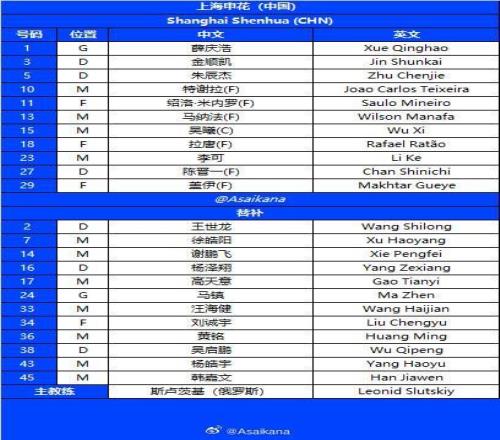 替补:2-王世龙、7-徐皓阳、14-谢鹏飞、16-杨泽翔、17-高天意、24-马镇、33-汪海健、34-刘诚宇、36-黄铭、38-吴启鹏、43-杨皓宇、45-韩嘉文