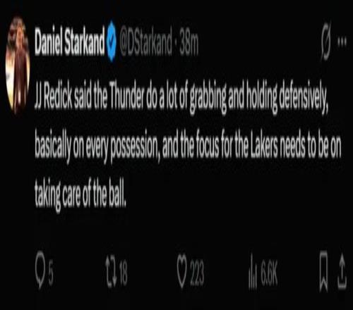 詹姆斯这场比赛拿到22+10+6,连续三场比赛拿到10+助攻是历史最年长的球员,而詹姆斯的言论就是侧面说明湖人阵容孱弱,而且湖人根本没有雷霆那样的防守资源。
