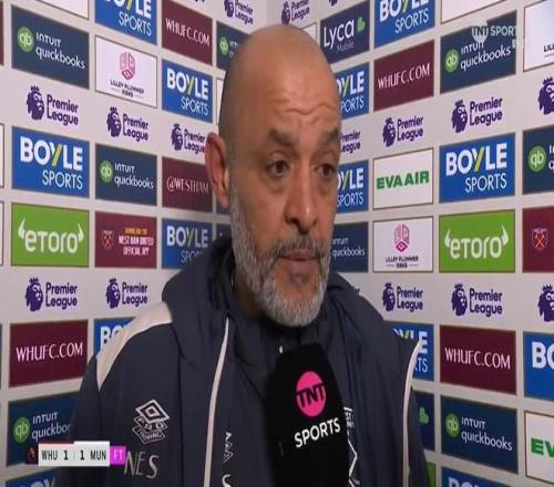 英超第26轮一场较量,西汉姆联主场被曼联绝平。赛后,铁锤帮主帅努诺接受了TNT体育的采访。