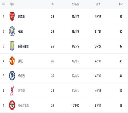 在积分榜上,阿森纳以56分高居榜首。曼城紧随其后,拿到50分,比阿森纳少6分,依然有冲击冠军的希望。阿斯顿维拉只拿到47分,排名第3,冲击冠军的机会很小。曼联战平,保住了第4的位置,总积分是45分。同样战平的切尔西以44分排名第5。利物浦只拿到39分,排名第6,争四前景比较悲观。布伦特福德也是39分,排名第7。纽卡斯尔联36分,排名第10。输球的热刺则掉到了第16名,只拿到29个积分。