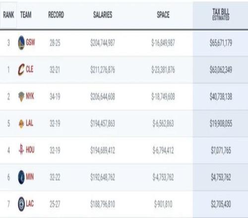 勇士6567万力压骑士6306万继续霸占榜首,尼克斯4074万奢侈税,湖人、火箭、森林狼、快船的奢侈税则分别是:1991万、707万、475万和271万。