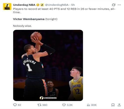 这场比赛文班亚马的表现过于炸裂,他一战创造了太多太多的纪录: