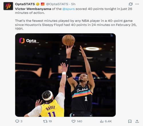 14.成为1991年弗洛伊德24分钟拿40+后首位26分钟拿40+的球员;