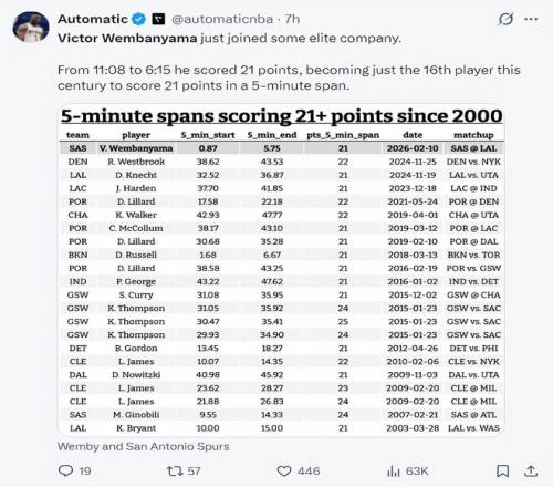 4.文班亚马单节25分钟是马刺队史有统计以来单节新高;