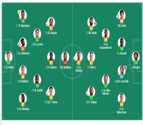 利物浦首发:1-阿利松、26-罗伯逊、4-范戴克、5-科纳特、38-赫拉芬贝赫、3-远藤航(69’2-戈麦斯)、10-麦卡利斯特、7-维尔茨、11-萨拉赫、18-加克波(75’17-琼斯)、22-埃基蒂克(88’14-基耶萨)。