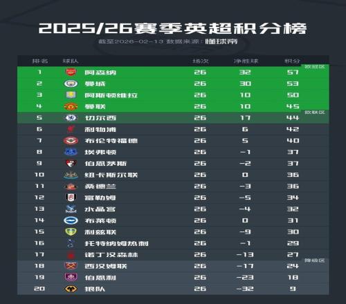 北京时间2月13日,2025/26赛季英超联赛结束了第26轮的全部比赛,积分榜的形势也产生了进一步的变化。