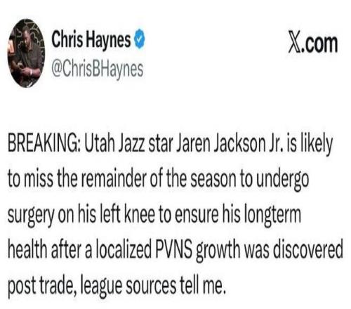 北京时间2月13日,当全明星球员贾伦-杰克逊被交易到爵士,仅出场3场比赛后,爵士官宣贾伦-杰克逊将因为膝伤接受膝盖手术,从而提前赛季报销。
