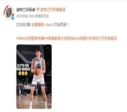 北京时间2月14日,杨瀚森的首次NBA全明星周末之旅,他8分钟5中4得到10分2篮板,虽然无缘晋级全明星新秀赛决赛,但表现已经足够出色,开拓者官方也是称赞“打出风采”。杨瀚森赛后回应最喜欢自己的那记外线三分,自嘲自己的中式英语让大家很开心,还表示最喜欢的全明星部分是与偶像约基奇聊天,甚至是等不及要亲约基奇。