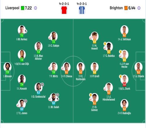 利物浦首发:1-阿利松、4-范戴克、5-科纳特、6-凯尔凯兹、7-维尔茨(72’2-戈麦斯)、8-索博斯洛伊、10-麦卡利斯特、11-萨拉赫(72’73-恩古莫哈)、14-基耶萨(72’22-埃基蒂克)、17-琼斯(89’42-尼奥尼)、18-加克波(89’47-卡尔文·拉姆塞)。