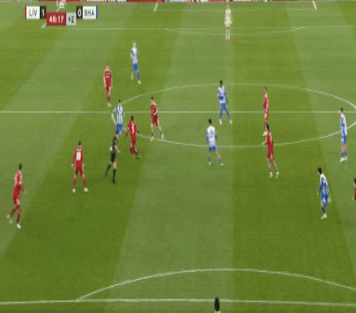 第40分钟,还是来自萨拉赫的传球,基耶萨的射门,被范赫克伸出一脚,完成解围。