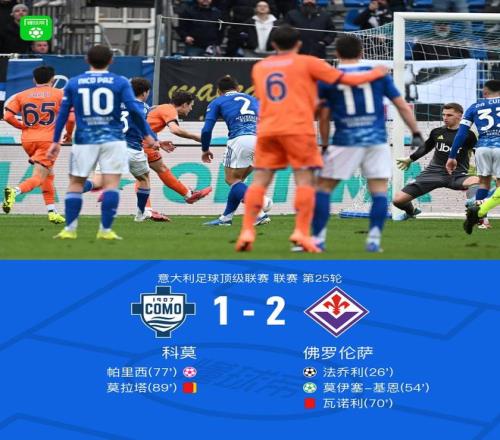 北京时间2月14日意大利足球顶级联赛第25轮,科莫主场对阵佛罗伦萨。佛罗伦萨法乔利率先破门,随后莫伊塞-基恩点球破门,帕里西自摆乌龙,比赛最后阶段,莫拉塔抱怨裁判连吃两黄被红牌罚下。最终十人科莫 1-2不敌佛罗伦萨。