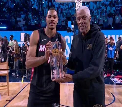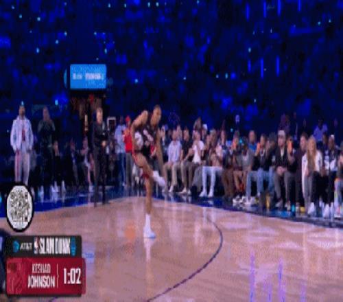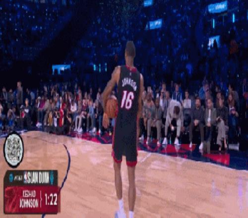 首轮最大的亮点是热火的约翰逊,这哥们儿不知道从哪请来了湾区说唱老炮E-40。老头往篮下一站,约翰逊直接起飞,飞跃这位60岁大爷的同时,最后摸着后脑勺单手扣进,47.4分。
