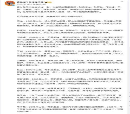 青岛海牛大年初一官宣十将!北京时间2月17日上午,青岛海牛俱乐部官宣,宋龙、孙正傲、邝兆镭、王峤、刘鑫瑜、张卫、穆斯塔帕、颜卓彬、吴星宇转会加盟俱乐部,韦子弦租借加盟。